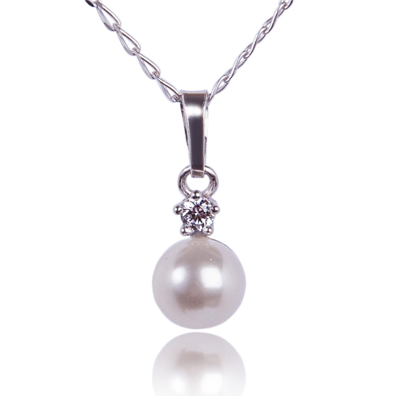 Elegantní, krásný a třpitivý přívěšek s perlou o velikosti 6mm, který je uchycen na velmi kvalitním stříbrném očku ryzosti 925/1000 české výroby a stříbrném řetízku 925/1000.